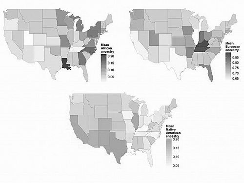 盡管平均值可能存在變化,但至少3.5%的歐洲裔美國人擁有非洲祖先。在南卡羅來納州和路易斯安那州,約12%的歐洲裔美國人至少有1%的非洲血統(tǒng)。同時在路易斯安那州,約8%的歐洲裔美國人至少擁有1%的印第安人祖先。
