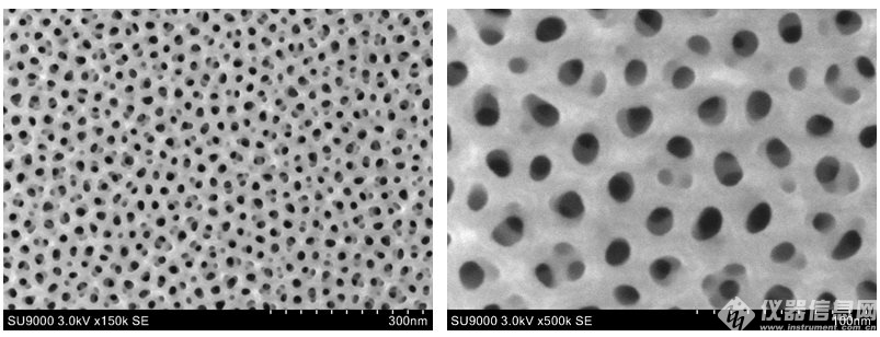 本例使用日立高新電子顯微鏡SU9000觀察陽極氧化鋁。 左圖的SE圖像可看出細(xì)孔是隨機(jī)排列的,而從右圖的SE圖像可以確認(rèn)到約0-30nm的細(xì)孔。