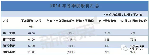 2014年第四季度成功在納斯達(dá)克上市的公司,上市價(jià)和IPO價(jià)之間的平均折扣為12%,比2013年的15%還低,與2012年被迫采取的剃頭式的24%的折扣相比有了顯著改善。