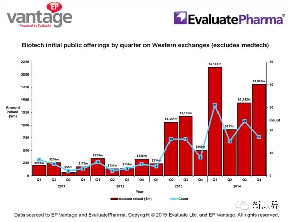 當(dāng)然,2014年63億美元的融資同樣讓人意外。但是,盡管面臨重大挫折,但投資市場的狀況看起來正在被融資公司逐漸控制,生物制藥公司幾乎肯定會(huì)繼續(xù)上市,這將使得2015年成為另一個(gè)IPO的強(qiáng)勢(shì)之年。