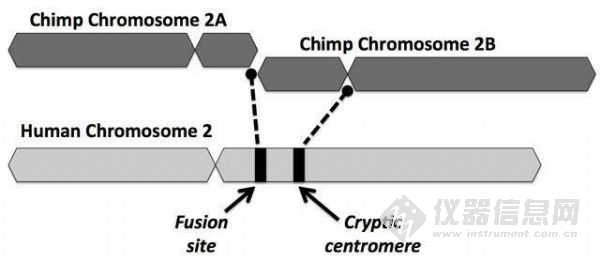 染色體是真核生物基因組所在的大型DNA組段。人類擁有23對染色體,黑猩猩則擁有24對。如果人類和黑猩猩關(guān)系很近,那么這個區(qū)別該如何解釋?我們可以猜測,在黑猩猩和人類分道揚(yáng)鑣之后,有兩對染色體在人類細(xì)胞內(nèi)融合成了一對。當(dāng)我們觀察人類2號染色體時,會發(fā)現(xiàn)它很像是兩條較短的黑猩猩染色體融合。2號染色體甚至擁有兩套染色體的特征,而其他都只有一套。這是怎么回事?