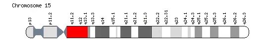 天使人綜合癥(Angelman syndrome)和普瑞德-威利綜合癥(Prader-Willi syndrome)都是由于第15號染色體印跡基因區(qū)15q11-13部分(紅色)的基因缺陷導(dǎo)致的。如果基因缺陷來自母親,或從父親那得到兩條帶此缺陷的基因,便會造成天使人綜合癥;而若基因缺陷來自父親,或從母親那得到了兩條帶缺陷的基因,則會造成普瑞德威利綜合癥。
