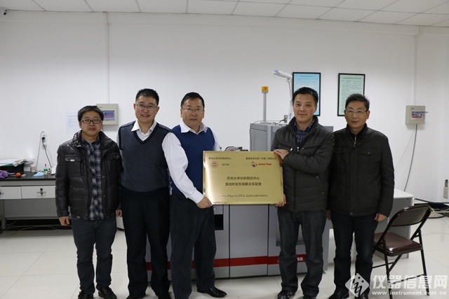 2015年1月8日,新年伊始,奧地利安東帕公司與蘇州大學(xué)分析測(cè)試中心聯(lián)合實(shí)驗(yàn)室正式揭牌成立。沒(méi)有奢華的儀式,但從分析測(cè)試中心主任張勇和安東帕小角X-射線散射產(chǎn)品銷(xiāo)售經(jīng)理馬戎、市場(chǎng)部經(jīng)理張加明共同舉起聯(lián)合實(shí)驗(yàn)室金色銘牌的那一刻起,標(biāo)志著雙方共同探索納米材料表征領(lǐng)域的合作,邁上了新的臺(tái)階。