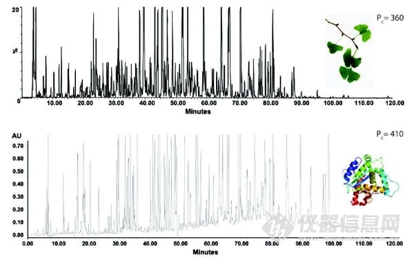 圖3 UHPLC 高分辨率分離(C18色譜柱,填充亞2μm顆粒)。(A)銀杏標(biāo)準(zhǔn)化提取物的色譜圖。梯度:5%到40%的乙腈,120分鐘,T=30°C, Lcol = 300mm,F(xiàn) = 0.2 mL/min,ΔPmax = 860 bar,峰容量可以達(dá)到360;(B)三種蛋白質(zhì)的結(jié)合胰蛋白酶消化酶的色譜圖。梯度:5%到60%的乙腈,120min ,T=30°C,Lcol = 40cm,F = 0.16 mL/min,ΔPmax = 940bar,峰容量可以達(dá)到410。