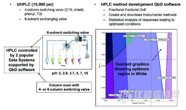 復(fù)雜混合物的HPLC方法開發(fā)是一個(gè)很耗時(shí)的工作,因?yàn)樾枰獌?yōu)化很多操作參數(shù)(柱尺寸,鍵合固定相和流動相A和B(有機(jī)溶劑/緩沖類型、pH值和離子強(qiáng)度)的類型,梯度洗脫時(shí)間和梯度范圍,柱溫度、流量)。一個(gè)常見的例子就是藥物活性成分(API)穩(wěn)定性指示分析或純度測定,其中所有的雜質(zhì)和降解產(chǎn)物必須分離,通過UV檢測器進(jìn)行準(zhǔn)確的定量。多年以來,基于模擬、預(yù)測、單純形優(yōu)化、柱/流動相篩選的軟件或自動化系統(tǒng)已經(jīng)促進(jìn)HPLC方法的開發(fā)。雖然他們似乎還沒有很普及,但持續(xù)的改進(jìn)提高了HPLC的性能和易用性。最新進(jìn)入市場的是一個(gè)附加軟件包,兼容兩個(gè)常用的色譜數(shù)據(jù)系統(tǒng)。對于HPLC方法開發(fā)過程(優(yōu)化)中最耗時(shí)的部分,該軟件利用用戶定義空間的自動化序列方法來解決,其中使用了實(shí)驗(yàn)設(shè)計(jì)(DoE)和質(zhì)量源于設(shè)計(jì)(QbD)的原則。導(dǎo)入完整的序列結(jié)果之后,該軟件還可以執(zhí)行統(tǒng)計(jì)分析,并顯示最佳條件。圖5說明了應(yīng)用在我們實(shí)驗(yàn)室的該軟件的概念和特征。自DoE 和 QbD概念被接受以來,最初用戶表現(xiàn)出很高的興趣。AMDS對致力于早期藥物開發(fā)方法的實(shí)驗(yàn)室特別有用。例如,為了支持利用多手性中心的復(fù)雜藥物分子進(jìn)行API合成和藥物產(chǎn)品制造,10-20種具有代表性的HPLC方法(原材料、起始物料、中間體、最終的原料藥和藥物產(chǎn)品的非手性和手性方法,)接二連三地被開發(fā)出來。