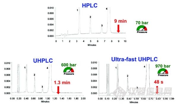 表1概述了UHPLC的突出特點(diǎn)和優(yōu)勢。注意,較高的系統(tǒng)壓力允許使用更小的微粒填充的柱子(如亞2μm)得到更快的分析速度(圖2)或復(fù)雜樣品更出色的分離(圖3)。由于使用改良的進(jìn)樣器,內(nèi)徑較小的管路系統(tǒng)(< 0.005英寸),更小的紫外檢測器流動池(0.5 - 2μL),所有的UHPLC都有比較低的系統(tǒng)擴(kuò)散(4σ時(shí),~10-20μL)。比較典型的應(yīng)用是內(nèi)徑為2.1–3.0mm的柱子,填充物為亞2μm或亞3μm顆粒。其他重要的系統(tǒng)特征包括更小的系統(tǒng)死體積(0.1-0.3 mL)和更快的檢測器響應(yīng)/數(shù)據(jù)采集速率(>40 pt/s),以實(shí)現(xiàn)高通量的應(yīng)用。