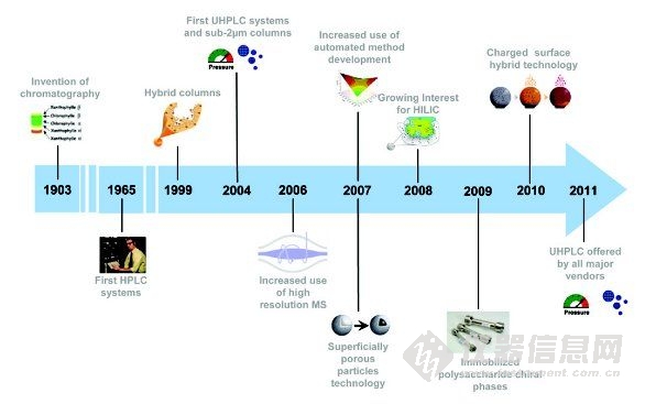 高效液相色譜技術(shù)最早應(yīng)用于藥物領(lǐng)域,包括效能/純度/性能分析、藥物(代謝)動力學(xué)/生物分析測試、純化、高通量篩選(HTS)、過程控制(IPC)監(jiān)測和質(zhì)量控制(QC)測試。制藥行業(yè)是HPLC的主要應(yīng)用市場,同時(shí)也是HPLC向更高通量和更優(yōu)性能發(fā)展的主要驅(qū)動力。本文簡要回顧了過去十年影響藥物分析發(fā)展的HPLC的重大進(jìn)展。討論的主題如下,部分項(xiàng)目體現(xiàn)在一個(gè)典型的時(shí)間軸上,如圖1所示。