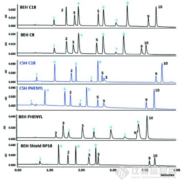 圖4 10種具有酸性、堿性和中性官能團(tuán)的商品化藥物在BEH和CSH分析柱的分析比較,梯度洗脫,流動相含乙腈和0.1%的甲酸。峰1、4、6和8是基本藥物。從文獻(xiàn)中復(fù)印,已取得許可。