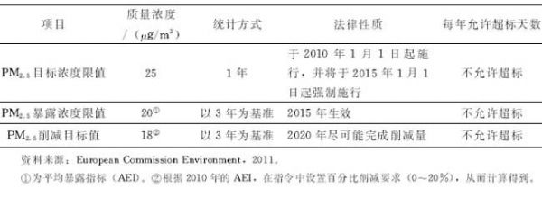 歐盟制定的PM2.5的目標(biāo)濃度限值、暴露濃度限值和削減目標(biāo)值