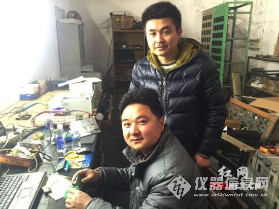 (潘光粲和黃兵在汽車修理廠的工作室內(nèi)用業(yè)余時間研究空氣監(jiān)測儀。)