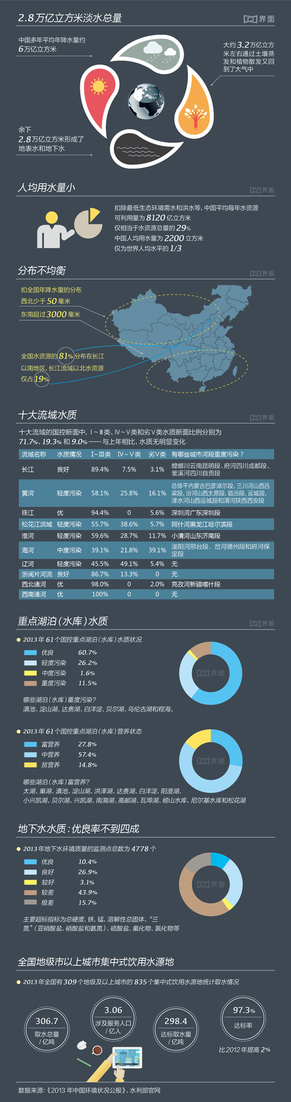 中國近日出臺了一份嚴(yán)厲的水污染防治計劃。在發(fā)布這份計劃的同時,環(huán)保部門指出,中國水污染的嚴(yán)重狀況仍未得到根本性遏制。一張圖讓你對中國水資源和污染狀況一目了然。