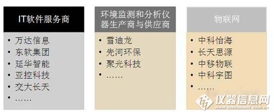 據(jù)目前智慧環(huán)保主要市場(chǎng)競(jìng)爭(zhēng)參與者來看,智慧環(huán)保市場(chǎng)競(jìng)爭(zhēng)主體主要有IT軟件服務(wù)商、環(huán)境監(jiān)測(cè)和分析儀器廠商、物聯(lián)網(wǎng)企業(yè),從環(huán)保IT服務(wù)解決方案、環(huán)境監(jiān)控系統(tǒng)以及環(huán)境在線監(jiān)控系統(tǒng)綜合集成等領(lǐng)域分別切入智慧環(huán)保市場(chǎng)。