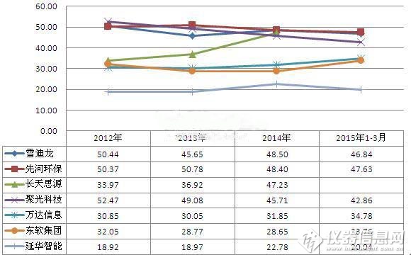 結(jié)合2012年-2014年,主要上市企業(yè)的毛利率來看,2014年各企業(yè)毛利率均在20%以上,表明智慧環(huán)保行業(yè)企業(yè)整體盈利水平較高。其中雪迪龍、先河環(huán)保、長天思源、聚光科技等環(huán)境監(jiān)測(cè)企業(yè)和物聯(lián)網(wǎng)企業(yè)毛利率水平最高,均在45%以上;其次為軟件服務(wù)商企業(yè),如萬達(dá)信息、東軟集團(tuán)和延華智能。