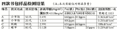 結(jié)果顯示,4款書包的游離甲醛數(shù)值分別為0.491mg/m3、1.514mg/m3、2.991mg/m3、0.128mg/m3。