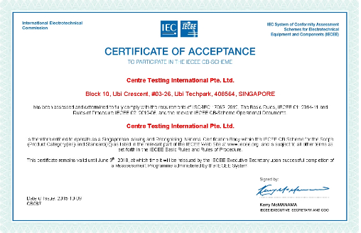 2015年10月9日,經(jīng)國際電工委員會(IECEE)評定,新加坡華測(Centre Testing International Pte.Ltd.)成為新加坡發(fā)證/認(rèn)可NCB(Singaporean Issuing and Recognising National Certification Body),CTI深圳實驗室也成為NCB新加坡華測責(zé)任下的CB實驗室(CBTL)。本次認(rèn)可的產(chǎn)品范圍包括電池(BATT)、家用及類似用途設(shè)備(HOUS)、照明設(shè)備(LITE)、信息技術(shù)及辦公設(shè)備(OFF)、安全變壓器及類似設(shè)備(SAFE)、音視頻設(shè)備(TRON)等6大類,標(biāo)準(zhǔn)涉及36項。