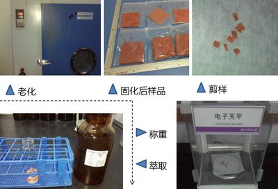 按照推薦性國家標(biāo)準(zhǔn)《合成材料跑道面層》對(duì)送檢試樣的要求,樣品應(yīng)在固化14天后進(jìn)行測試。因事情緊急,EMTEK信測為更客觀地檢測操場情況,將樣品放入烤箱加速其固化,剪樣、稱重、萃取。