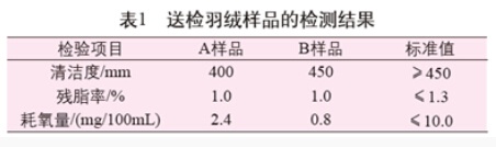 分析白色羽絨服泛黃現(xiàn)象的原因可能出現(xiàn)在兩方面:一是服裝面料,尤其是加熒光增白劑的面料;二是羽絨填充物。為此,本文以兩批洗后泛黃的羽絨服裝進(jìn)行模擬洗衣試驗(yàn)。結(jié)果發(fā)現(xiàn),單獨(dú)清洗面料,面料沒(méi)有發(fā)黃;清洗成衣,出現(xiàn)泛黃的狀況。綜上可知,羽絨填充物對(duì)成衣洗后泛黃的影響較大。依據(jù)GB/T 14272—2011《羽絨服裝》標(biāo)準(zhǔn),我們對(duì)填充物的清潔度、耗氧量和殘脂率這3個(gè)方面進(jìn)行考察,兩塊樣品的結(jié)果如表1。