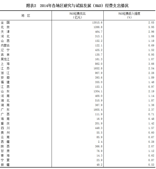 2014年,全國共投入研究與試驗發(fā)展(R&D)經(jīng)費13015.6億元,比上年增加1169.0億元,增長9.9%;研究與試驗發(fā)展(R&D)經(jīng)費投入強度(與國內(nèi)生產(chǎn)總值[1]之比)為2.05%,比上年提高0.04個百分點。按研究與試驗發(fā)展人員(全時工作量)計算的人均經(jīng)費支出為35.1萬元,比上年增加1.6萬元。