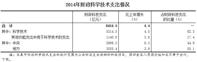 2014年,國家財政科學技術(shù)支出為6454.5億元,比上年增加269.6億元,增長4.4%;財政科學技術(shù)支出占當年國家財政支出的比重為4.25%。其中,中央財政科技支出為2899.2億元,增長6.3%,占財政科技支出的比重為44.9%;地方財政科技支出為3555.4億元,增長2.9%,占比為55.1%。