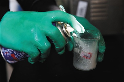 12月17日,實驗室工作人員將圣誕噴雪噴入燒杯中,準備檢測重金屬含量。