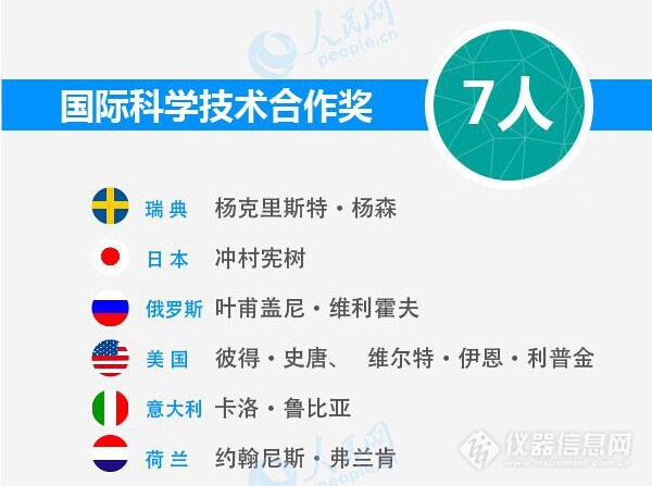 中華人民共和國國際科學技術合作獎7人:楊克里斯特·楊森(瑞典),沖村憲樹(日本),葉甫蓋尼·維利霍夫(俄羅斯),彼得·史唐(美國),維爾特·伊恩·利普金(美國),卡洛·魯比亞(意大利),約翰尼斯·弗蘭肯(荷蘭)。