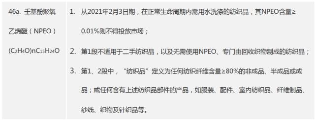 2016年1月14日,歐盟官方公布發(fā)布REACH法規(guī)的修訂案(EU) 2016/26,新增REACH附錄XVII條款46a,規(guī)定2021年2月3日起NPEO含量超過0.01%的紡織品將禁止投放歐盟市場(chǎng)。具體條款如下表所示:
