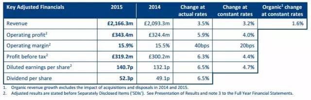 天祥集團(Intertek)2015年年報顯示,2015年全年總營業(yè)收入為21.66億英鎊,增長3.5%。業(yè)績總體情況及各部分營業(yè)收入如下:
