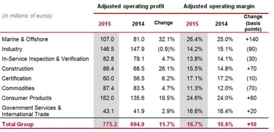 必維國際檢驗集團2015年年報顯示,BV 2015 年總營收達到 46 億歐元,增長 11.1%;調(diào)整后營業(yè)利潤達 7.75 億歐元,增長 11.7%。各部分營業(yè)情況如下: