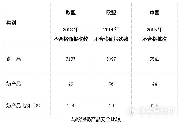 歐盟官方的食品與飼料快速預警系統(tǒng)(RASFF)2013年年度報告中,食品不合格通報3137起,其中奶產(chǎn)品相關(guān)43起,占1.4%;2014年年度報告中,食品不合格通報3097起,其中奶產(chǎn)品相關(guān)66起,占2.1%。2015年,國家食品藥品監(jiān)督管理總局發(fā)布報告顯示,我國不合格食品5541批次,其中不合格奶產(chǎn)品44批次,不合格奶產(chǎn)品僅占不合格食品的0.8%。