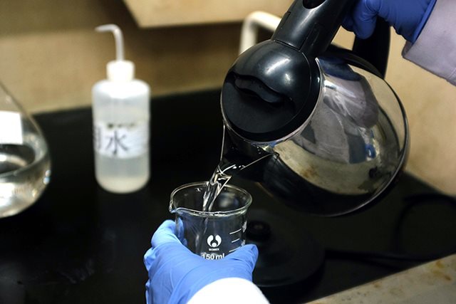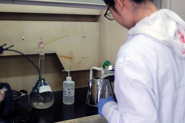 實驗人員往里面加入水(國標要求使用醋酸溶劑,此處為實驗演示畫面)。