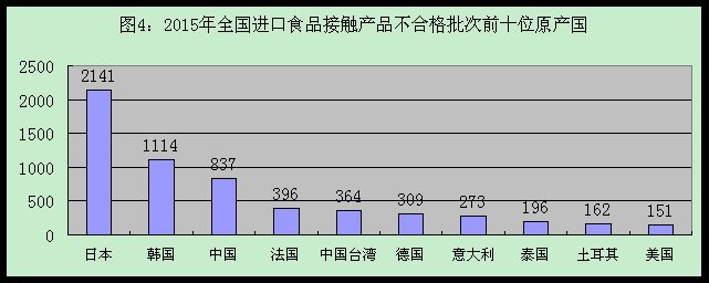 從不合格產(chǎn)品原產(chǎn)國(guó)分布情況來(lái)看,2015年度進(jìn)口食品接觸產(chǎn)品不合格批次原產(chǎn)國(guó)(或地區(qū))前十位依次是日本、韓國(guó)、中國(guó)(出口復(fù)進(jìn)口)、法國(guó)、中國(guó)臺(tái)灣、德國(guó)、意大利、泰國(guó)、土耳其、美國(guó),原產(chǎn)上述十國(guó)(或地區(qū))的不合格批次合計(jì)5943批(見(jiàn)圖4),占不合格總批次的71.3%,其中原產(chǎn)日本、韓國(guó)的不合格批次占總不合格批次的39.1%。