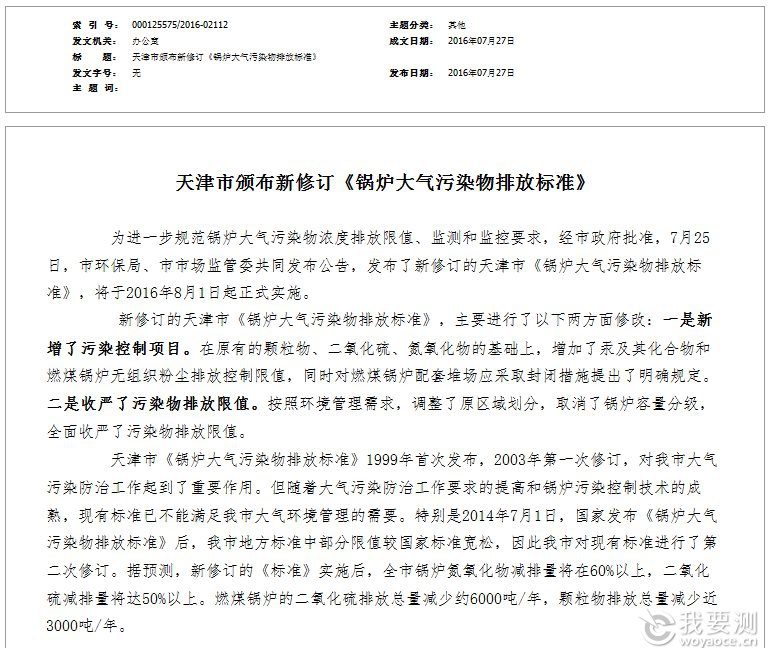 從天津市環(huán)保部門了解到,為進(jìn)一步規(guī)范鍋爐大氣污染物濃度排放限值、監(jiān)測和監(jiān)控要求,經(jīng)天津市政府批準(zhǔn),7月25日,天津市環(huán)保局、市市場監(jiān)管委共同發(fā)布公告,發(fā)布了新修訂的天津市《鍋爐大氣污染物排放標(biāo)準(zhǔn)》,該標(biāo)準(zhǔn)將于2016年8月1日起正式實施。