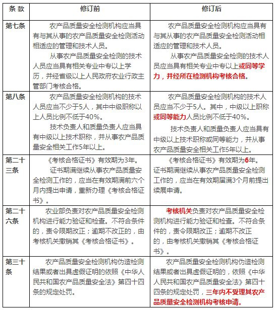 《農(nóng)產(chǎn)品質(zhì)量安全檢測機構(gòu)考核辦法》修訂前后對照表