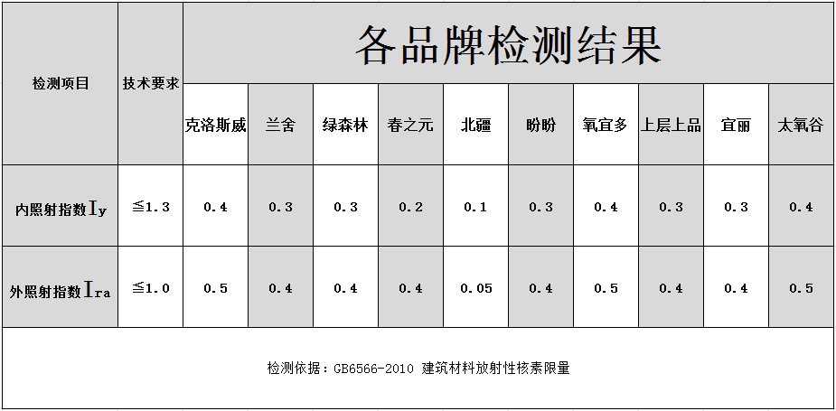 這十個(gè)品牌產(chǎn)品檢測(cè)結(jié)果中,全部符合國(guó)家關(guān)于室內(nèi)裝飾裝修材料建筑放射性核素限量標(biāo)準(zhǔn)。