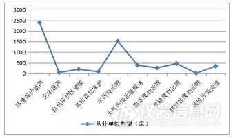 從從業(yè)人員看,環(huán)境治理業(yè)從業(yè)人數(shù)以超總?cè)藬?shù)的60%居于首位。環(huán)境與生態(tài)監(jiān)測(cè)領(lǐng)域以吸引近11萬(wàn)人從業(yè)而位居次席。從事生態(tài)保護(hù)的人員不足1.4萬(wàn)人。