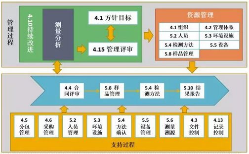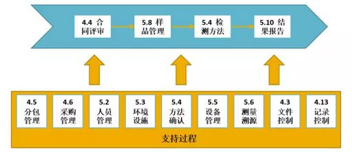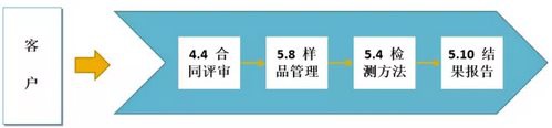 檢測(cè)過(guò)程是實(shí)驗(yàn)室的核心過(guò)程,又叫關(guān)鍵過(guò)程。對(duì)于實(shí)驗(yàn)室而言,其最終產(chǎn)品就是數(shù)據(jù),那么“生產(chǎn)”數(shù)據(jù)的檢測(cè)過(guò)程就是其核心過(guò)程。在ISO/IEC 17025中,條款4.4合同評(píng)審、5.8樣品管理、5.4 檢測(cè)方法和5.10結(jié)果報(bào)告屬于核心過(guò)程,如下圖所示: