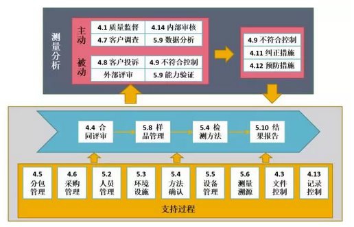 實(shí)驗(yàn)室管理過(guò)程中首要任務(wù)是對(duì)檢測(cè)過(guò)程和支持過(guò)程進(jìn)行測(cè)量分析,也可以說(shuō)是過(guò)程診斷,測(cè)量分析分為主動(dòng)測(cè)量分析和被動(dòng)測(cè)量分析。ISO/IEC 17025條款4.1中的質(zhì)量監(jiān)督、4.14內(nèi)部審核、5.9中的數(shù)據(jù)分析等就是主動(dòng)的測(cè)量分析活動(dòng),而4.8中的客戶投訴和4.9中的不符合工作等則屬于被動(dòng)的測(cè)量分析。測(cè)量分析得到的結(jié)果通過(guò)4.9 不符合工作控制、4.11糾正措施、4.12預(yù)防措施等工作得到整改或改進(jìn),再重新反饋到檢測(cè)過(guò)程和支持過(guò)程中,從而實(shí)現(xiàn)過(guò)程的持續(xù)改進(jìn)。