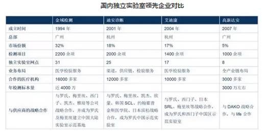 現(xiàn)在國內市場上金域檢驗、達安基因、迪安診斷、艾迪康四家公司已經占據了70%以上的份額,其中金域檢驗是中國目前最大的臨床檢驗服務公司,以普檢為主總計2200多種項目;達安基因主營業(yè)務是基因檢測試劑的研發(fā)生產銷售,大概1000余項檢測項目,目前在廣州、上海、合肥、成都等地都有實驗室;迪安診斷總部在杭州,現(xiàn)在大概2000余項醫(yī)學診斷項目,在環(huán)渤海灣、長三角、珠三角領域有優(yōu)勢;艾迪康現(xiàn)在可以提供1400余項檢測項目,為全國10000多家醫(yī)療機構提供服務。此外,還有康圣環(huán)球醫(yī)學特檢集團(北京海思特臨床檢驗所、武漢康圣達醫(yī)學檢驗所、上海新培晶醫(yī)學檢驗所)是目前國內最大的特種臨床檢驗服務公司。