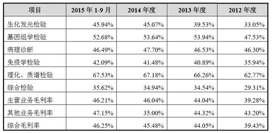 接下來實驗室便會進入一個利潤高速增加的階段,參考新三板掛牌企業(yè)洛奇檢驗在13-15年度的凈利潤一般在30%左右(小微企業(yè)剛起步階段凈利潤較高,主板上市企業(yè)比如迪安診斷等隨著擴展渠道和收購標的等資源投入,這幾年凈利潤不超過10%),再比較金域檢驗上市披露的檢驗項目毛利率表格:
