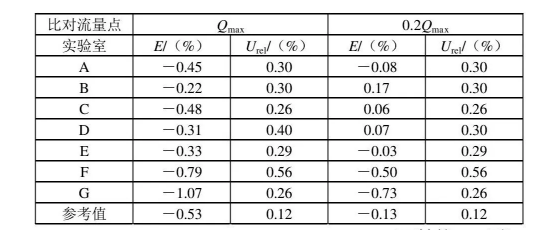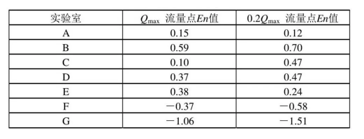 由比對結(jié)果可知, 6 個參比實驗室中只有G實驗室結(jié)果不滿意, 兩個比對流量點En值均大于1, 說明G實驗室的測量結(jié)果不符合實驗室要求的擴展不確定度。G實驗室應分析其中原因, 采取糾正措施, 然后再次參加實驗室間比對或測量審核活動驗證所采取措施的有效性。其他參比實驗室結(jié)果均滿意。實驗室可將此次比對作為一次能力驗證活動, 在認可周期內(nèi)無需再參加其他組織的能力驗證活動。結(jié)合上表中的數(shù)據(jù)不難發(fā)現(xiàn), F實驗室在Qmax這個點比E實驗室距離參考值更遠, 但En值卻比E實驗室小, 原因是F實驗室的擴展不確定度0.56%遠大于E實驗室的0.29%.