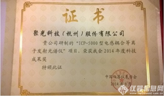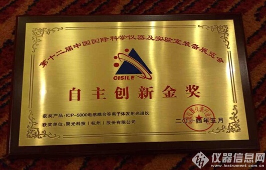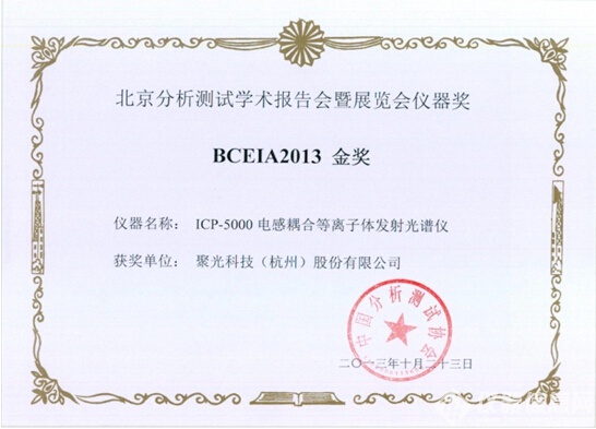 ICP-5000在2013年5月14日舉辦的中國分析測試協(xié)會的專家鑒定會上,得到了專家們的一致認(rèn)可,均稱贊此產(chǎn)品已經(jīng)達(dá)到國際同類產(chǎn)品先進(jìn)水平,在2013年10月舉辦的BECIA展會和2014年5月舉辦的CISILE展會均得到金獎,在2014年9月MICONEX展會上,獲得科技成果獎;