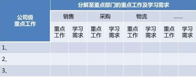 基于學(xué)習(xí)需求的分解,公司從戰(zhàn)略重點出發(fā)形成各個相關(guān)部門的工作要求,而這些工作要求就會形成具體的培訓(xùn)(學(xué)習(xí))需求。經(jīng)過層層分解,應(yīng)該最后形成一張對應(yīng)到各部門的戰(zhàn)略級學(xué)習(xí)需求表。