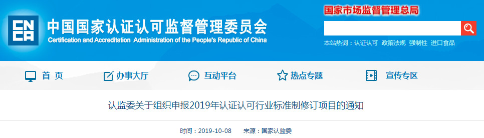 為深入貫徹落實《國務(wù)院關(guān)于加強質(zhì)量認證體系建設(shè)促進全面質(zhì)量管理的意見》(國發(fā)〔2018〕3號)精神,充分發(fā)揮技術(shù)標準對認證認可事業(yè)發(fā)展的支撐保障作用,根據(jù)《認證認可行業(yè)標準制(修)訂工作程序》(國認科[2018]15號),認監(jiān)委決定組織開展2019年認證認可行業(yè)標準(以下簡稱認標)制修訂項目申報工作,現(xiàn)將有關(guān)事項通知如下: