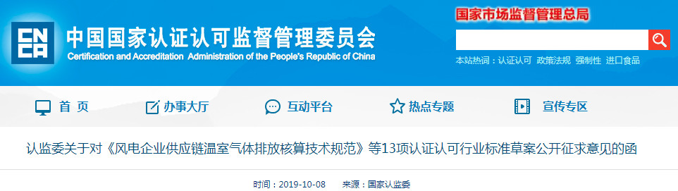根據(jù)《認證認可行業(yè)標準制(修)訂工作程序》(國認科〔2018〕15號)相關(guān)要求,各認證認可行業(yè)標準(以下簡稱認標)制訂單位已完成了《風(fēng)電企業(yè)供應(yīng)鏈溫室氣體排放核算技術(shù)規(guī)范》等13項認標草案的編寫工作。為保證標準的適用性及科學(xué)性,現(xiàn)對這13項認標草案公開征求意見。各認標草案聯(lián)系人名單見附件1,各認標草案征求意見材料見附件2-14。