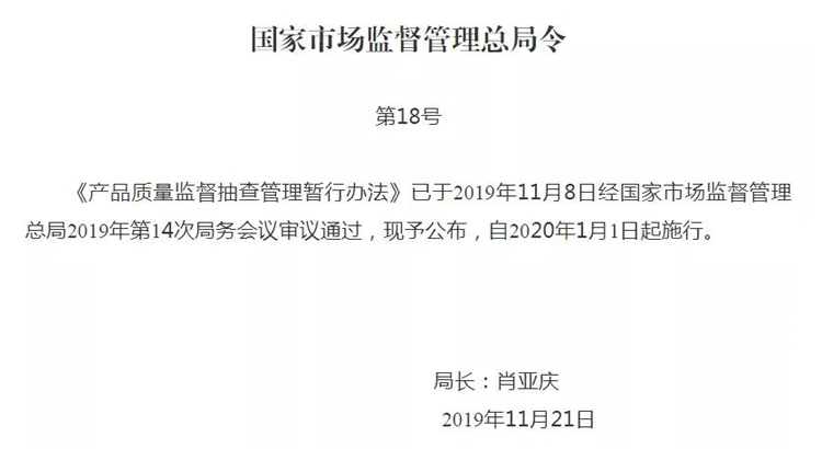 第五十六條 本辦法自2020年1月1日起施行。2010年12月29日原國家質(zhì)量監(jiān)督檢驗檢疫總局令第133號公布的《產(chǎn)品質(zhì)量監(jiān)督抽查管理辦法》、2014年2月14日原國家工商行政管理總局令第61號公布的《流通領(lǐng)域商品質(zhì)量抽查檢驗辦法》、2016年3月17日原國家工商行政管理總局令第85號公布的《流通領(lǐng)域商品質(zhì)量監(jiān)督管理辦法》同時廢止。