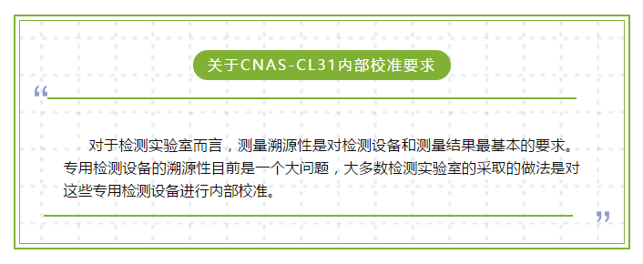 CNAS-CL31:2011《內(nèi)部校準(zhǔn)要求》,是CNAS首次對(duì)檢測(cè)實(shí)驗(yàn)室內(nèi)部校準(zhǔn)工作進(jìn)行了規(guī)范,用以保證檢測(cè)結(jié)果的測(cè)量溯源性。