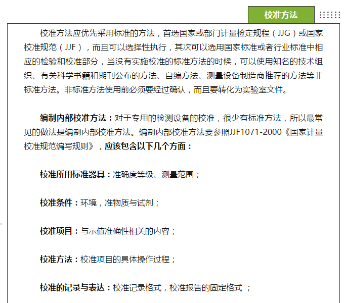 六、內(nèi)部校準(zhǔn)所用方法,應(yīng)優(yōu)先用標(biāo)準(zhǔn)方法(國(guó)際、國(guó)家、行業(yè)、區(qū)域組織等發(fā)布的方法),當(dāng)沒有標(biāo)準(zhǔn)方法時(shí),可以使用自編方法、廁靈設(shè)備制造商推薦的方法等非標(biāo)方法。當(dāng)使用非標(biāo)方法時(shí),應(yīng)經(jīng)過驗(yàn)證和確認(rèn)。非標(biāo)方法的技術(shù)要素應(yīng)符合《國(guó)家計(jì)量校準(zhǔn)規(guī)范編寫規(guī)則》(JJF1071-2000)的規(guī)定。