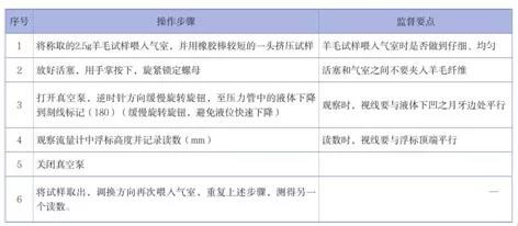 例如,羊毛檢測人員按照檢測標準SN/T0473—2003《進出口含脂毛檢驗規(guī)程》中5.3.1氣流儀法,用微拉氣流儀進行羊毛細度的檢測。在監(jiān)督過程中,要注意觀察該人員的幾個關(guān)鍵操作步驟是否規(guī)范、流暢,具體監(jiān)督要點參見表1。
