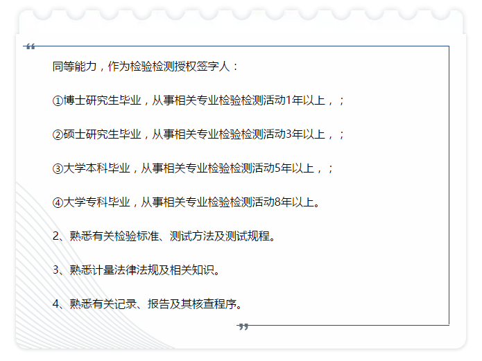 1、自2015年起,檢驗(yàn)檢測(cè)機(jī)構(gòu)授權(quán)人簽字人的資質(zhì)已從原來的中級(jí)以上(含中級(jí))技術(shù)職稱改為了中級(jí)以上(含中級(jí))技術(shù)職稱或同等能力。