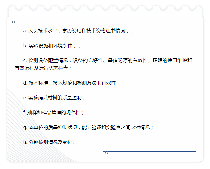報(bào)告內(nèi)容的完整性,報(bào)告信息、項(xiàng)目的齊全性,檢驗(yàn)依據(jù)、方法的正確性,檢驗(yàn)數(shù)據(jù)的準(zhǔn)確性和檢驗(yàn)結(jié)論的正確性。